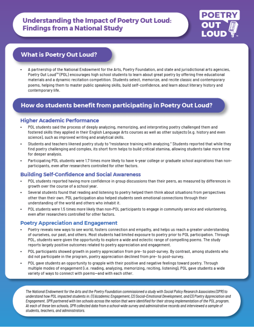 During her tenure at the NEA, Dr. Shaffer directed an evaluation study of Poetry Out Loud, a national arts education program supported by the National Endowment for the Arts, the Poetry Foundation, and state and jurisdictional arts agencies. The quasi-experimental study—involving data collection from ten sample schools—assessed the program’s impact on poetry appreciation and engagement, social and emotional development, and academic performance.